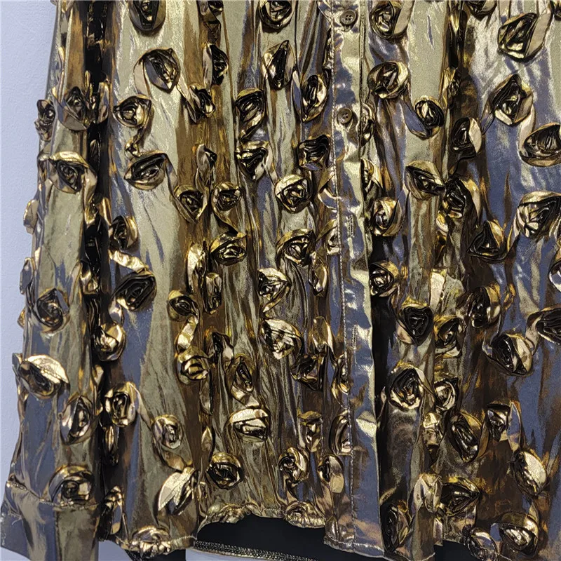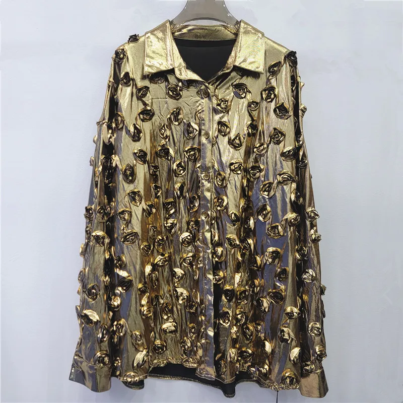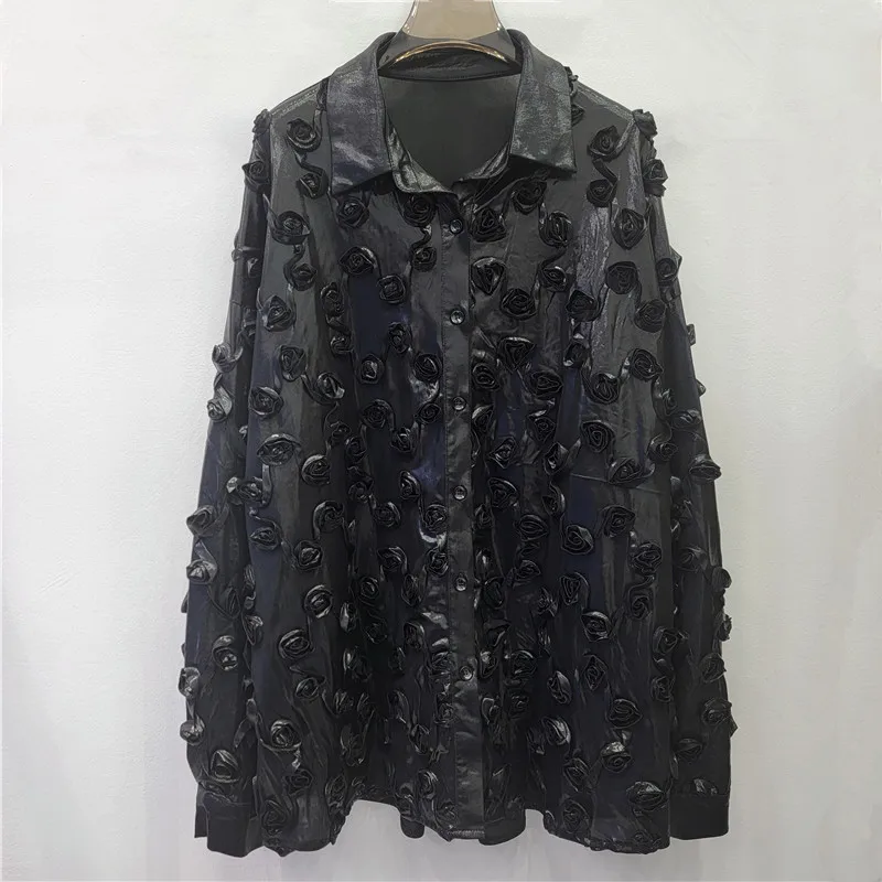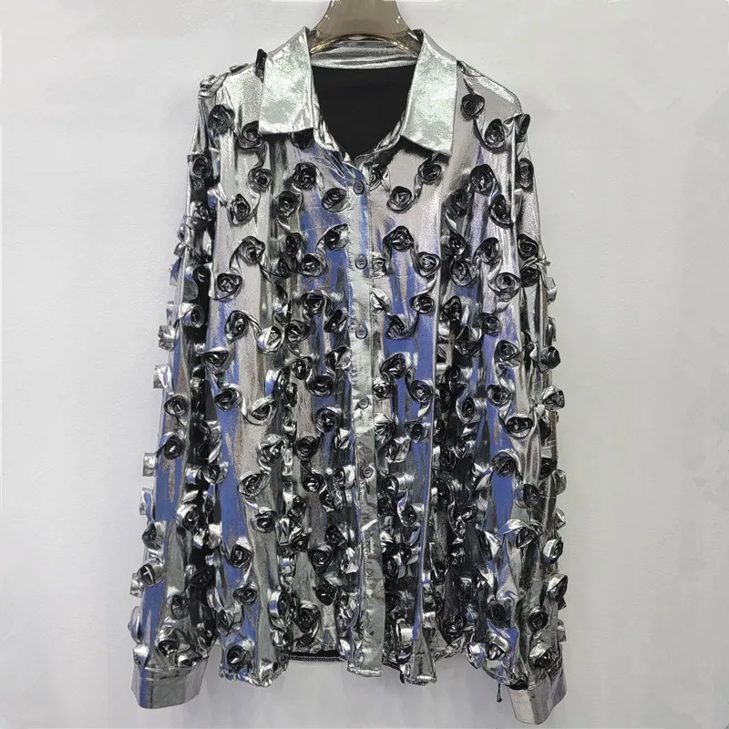 Bettergirl 2026 Early spring new three-dimensional flower lapel long sleeved shiny top